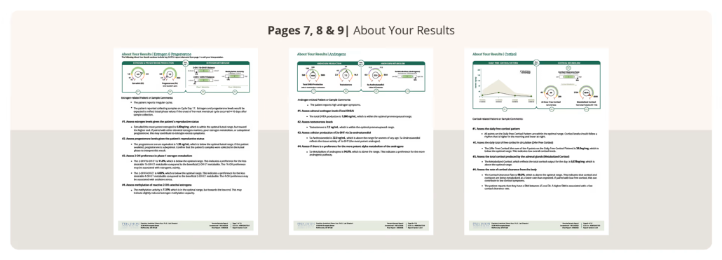To increase your confidence and help you focus on the key takeaways from the DUTCH report, Precision Analytical has reintroduced comments pages into new pages titled “About Your Results”. These pages provide an interpretive framework to accompany the new Hormone Testing Summary page, including twelve assessments that prioritize the most critical aspects of estrogen, progesterone (for women), androgens, and cortisol balance.